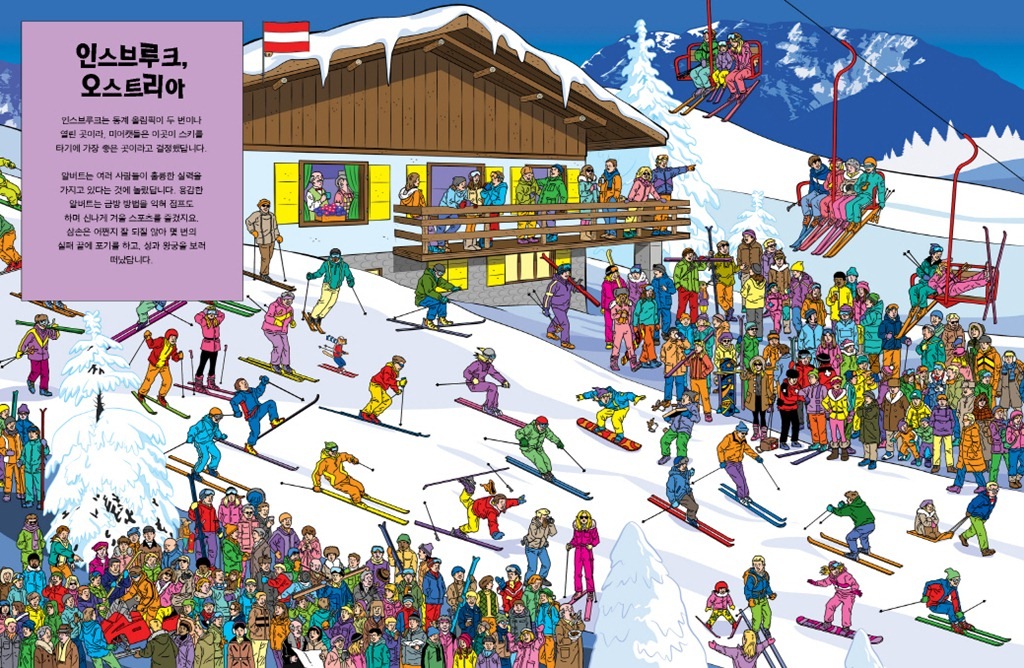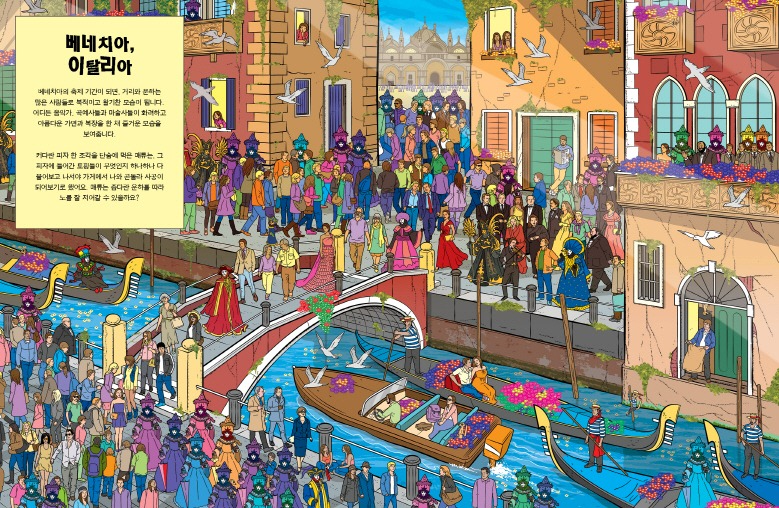 거리가 너무 복잡하고 사람도 굉장히 많지만 주의 깊게 잘 찾아보면 미어캣 가족들을 발견할 수 있을 거예요. 자, 눈을 크게 뜨고 찾아보자고요~ 혼자서 찾기 힘들다면, 가족이나 친구들과 함께 찾아보는 것도 좋아요. 누가 빨리 그리고 많은 미어캣을 찾을 수 있을지 내기해 볼까요? 처음엔 잘 되지 않을지도 모르지만, 집중하면서 조금씩 상상력도 발휘하다 보면 점점 집중력과 주의력이 높아져서 금세 찾아낼 수 있어요.