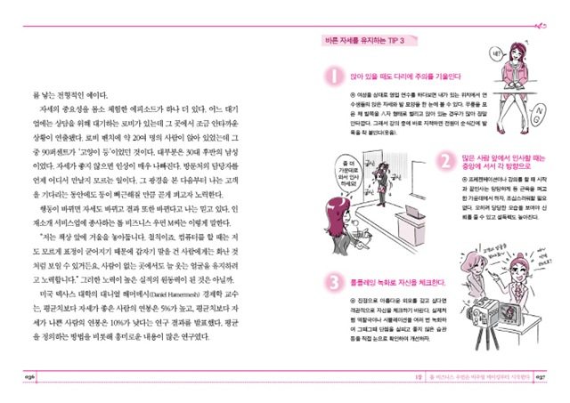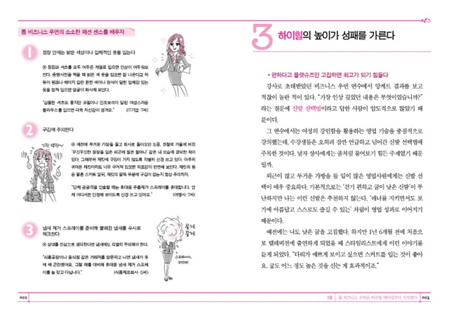 이 책에 나오는 비법들은 누구나 따라 할 수 있는 쉬운 것이지만, 그것을 몸에 익혀 실천할 수 있는가가 관건이다. 예를 들어, 영업에 매진하기 위해 플랫슈즈와 바지 정장만 입으며 바삐 뛰어다닌다고 해서, 좋은 실적을 거둘 수 있을 것인가? 저자는 No! 라고 말한다. 상황과 분위기에 따라 매너에 맞는 비주얼 메이킹이 필요하다. 필요할 때는 과감한 하이힐을 골라 신을 줄 알아야 하며, 예상치 못한 상황에도 언제나 적절하게 대처할 수 있는 기본 지식이 필요하다.