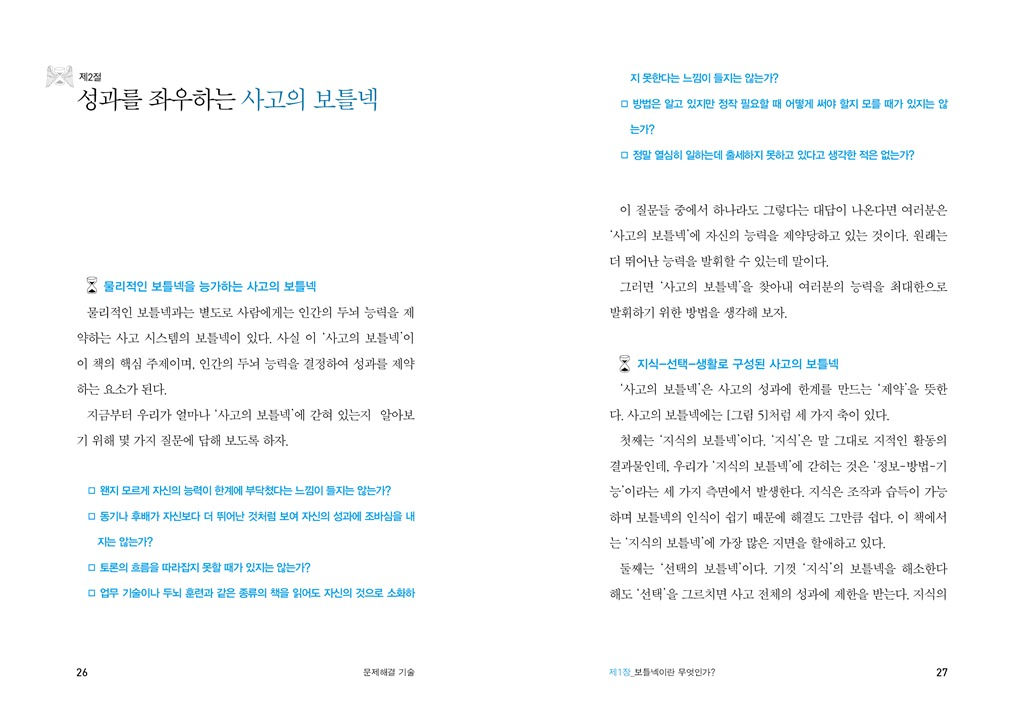 <문제해결 기술>은 이러한 조직과 업무, 개인의 사고 시스템에 병목으로 작용하는 요소들을 찾아내고 그 병목을 없애는 방법을 명확히 하는 것이다.