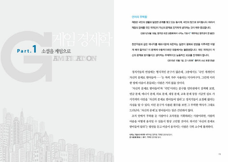 하지만 세계적인 기업들을 벌써 게임이 가진 무한한 가능성에 관심을 가지고 실제 사업 전략에 활용하고 있다. 게임을 만들어 고객과 소통하고 수익을 올리며 기업 이미지를 개선해 나가기도 한다. 이처럼 ‘게임의 개념이나 디자인 기법 등의 요소를 게임 이외의 사회적 활동이나 서비스에 이용하는 것’이 바로 게이미피케이션이다. 즉, 게임에 내재한 여러 가지 요소를 비즈니스를 비롯한 일상생활 전반에 활용하는 것이다. <게임 경제학>에서는 게이미피케이션의 정확한 개념과 활용 노하우를 구체적인 사례를 바탕으로 명쾌하게 설명한다.