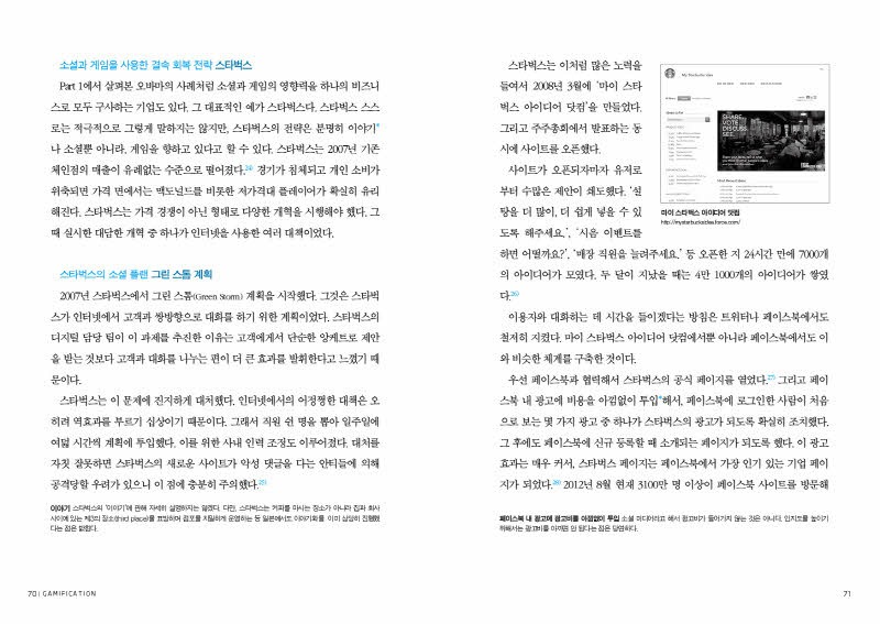 2007년, 매출 부진으로 고심하던 스타벅스도 게이미피케이션 기법을 끌어들여 개혁에 성공했다. 그 때 사용되었던 기법 중 하나가 ‘스타벅스 리워드’라는 프로그램이다. 우리나라에도 도입된 스타벅스 리워드는 단골 고객에게 일종의 특전을 주는 것으로, 스타벅스를 많이 이용할수록 레벨이 높아져 더욱 다양한 혜택을 누릴 수 있는 구조다. 처음 등록하면 생일에 무료 음료를 마실 수 있고 다섯 번 이용하면 그린 레벨이 되어 시럽이나 우유 등을 무료로 이용할 수 있게 되는 식이다. 게임의 레벨업 시스템을 이용해 성공한 대표 케이스 중 하나라 할 수 있겠다.