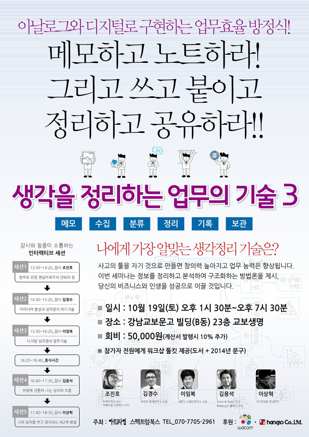 2012년 시작된 생각정리 세미나 3회가 2013년 10월 19일 (토) 1시반 부터 7시반까지 강남 교보문고타워 (B동) 23층에서 계최됩니다.