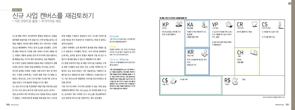 파트 6과 파트 7 부록에서는 국내 및 해외 기업과 조직, 개인의 캔버스 작성 사례를 소개한다. 기업을 분석하다 난관에 부딪쳤을 때 파트 6에 실린 타사의 사례를 참고하면 큰 도움이 될 것이다.