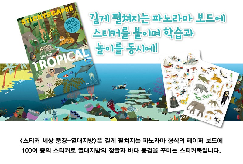 <스티커 세상 풍경-열대지방>은 길게 펼쳐지는 파노라마 형식의 페이퍼 보드에 100여 종의 스티커로 열대지방의 정글과 바다 풍경을 꾸미는 스티커북입니다.