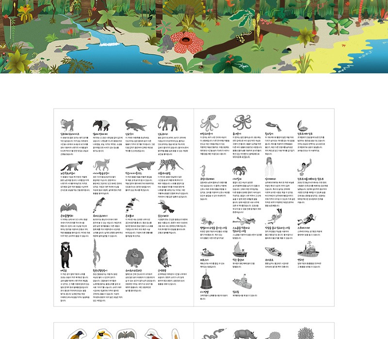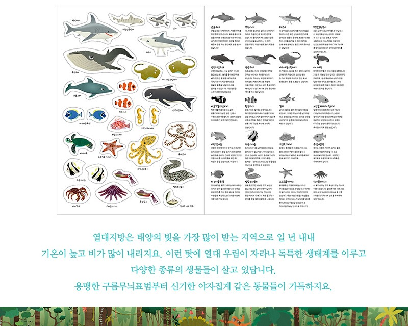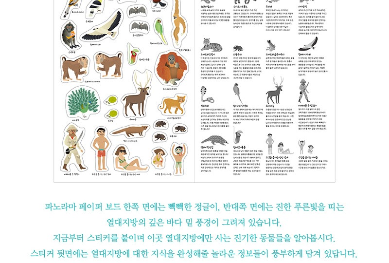 지금부터 스티커를 붙이며 이곳 열대지방에만 사는 진기한 동물들을 알아봅시다. 스티커 뒷면에는 열대지방에 대한 지식을 완성해줄 놀라운 정보들이 풍부하게 담겨 있답니다.