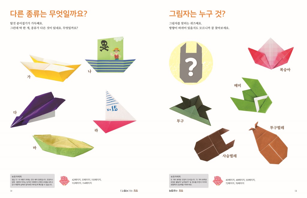 <종이접기 퍼즐&퀴즈>는 완성품을 여러 각도에서 촬영한 사진들을 보기로 든 문제, 그림자로 완성품을 알아맞히는 문제, 거울에 비친 모습으로 좌우대칭을 확인하는 문제 등으로 아이들의 관찰력 및 상상력을 높여줍니다.