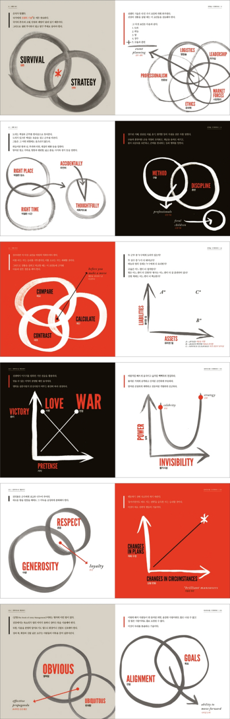 <생각 정리를 위한 손자병법>은 동양의 대표적인 고전인 손자병법을 도표와 그래프로 재구성한 독특한 책이다. 언뜻 간단해 보이지만 사실 이는 쉽지 않은 고난한 작업이다. 지혜의 정수를 간단한 도표와 그래프로 옮기는 작업이 만만할 리가 없다. 하지만 비주얼 씽킹 분야에서 다년간 작업을 하면 내공을 쌓은 저자 재시카 해기는 마침내 오롯이 결과물을 내놓을 수 있었다.