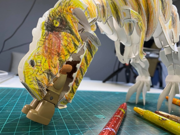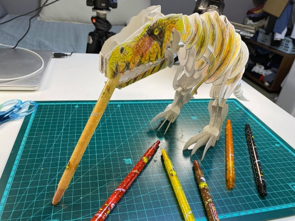 공룡도 그림그려보려고 색연필을 입에 물었어요. 공룡 입이랑 허리가 움직여서 다양한 연출을 할 수 있어요! 디오라마로 같이 놀고 있는 모습을 촬영하거나 스톱모션 애니메이션을 만들 수 있습니다. 이제 카메라 앱을 사용해서 스톱모션을 만드는 강의를 해볼 생각입니다.