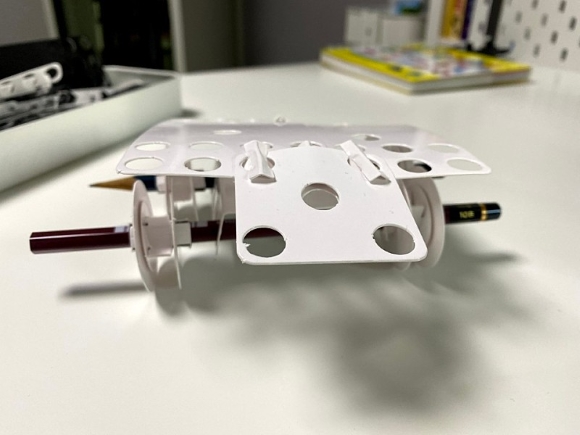 컴퓨터사인펜을 사용한 이유는 집에 연필이 하나도 남아있지 않아서 ㅠㅠ 하도 페이퍼브릭으로 차를 만들었더니 검정색연필이 없었어요… 일단 동작은 잘하고 이번에는 기차의 차체 안쪽으로 바퀴를 만들어 넣었습니다. 큰바퀴를 넣었더니 약간 공간이 뜨기는 해도 잘 굴러갑니다.