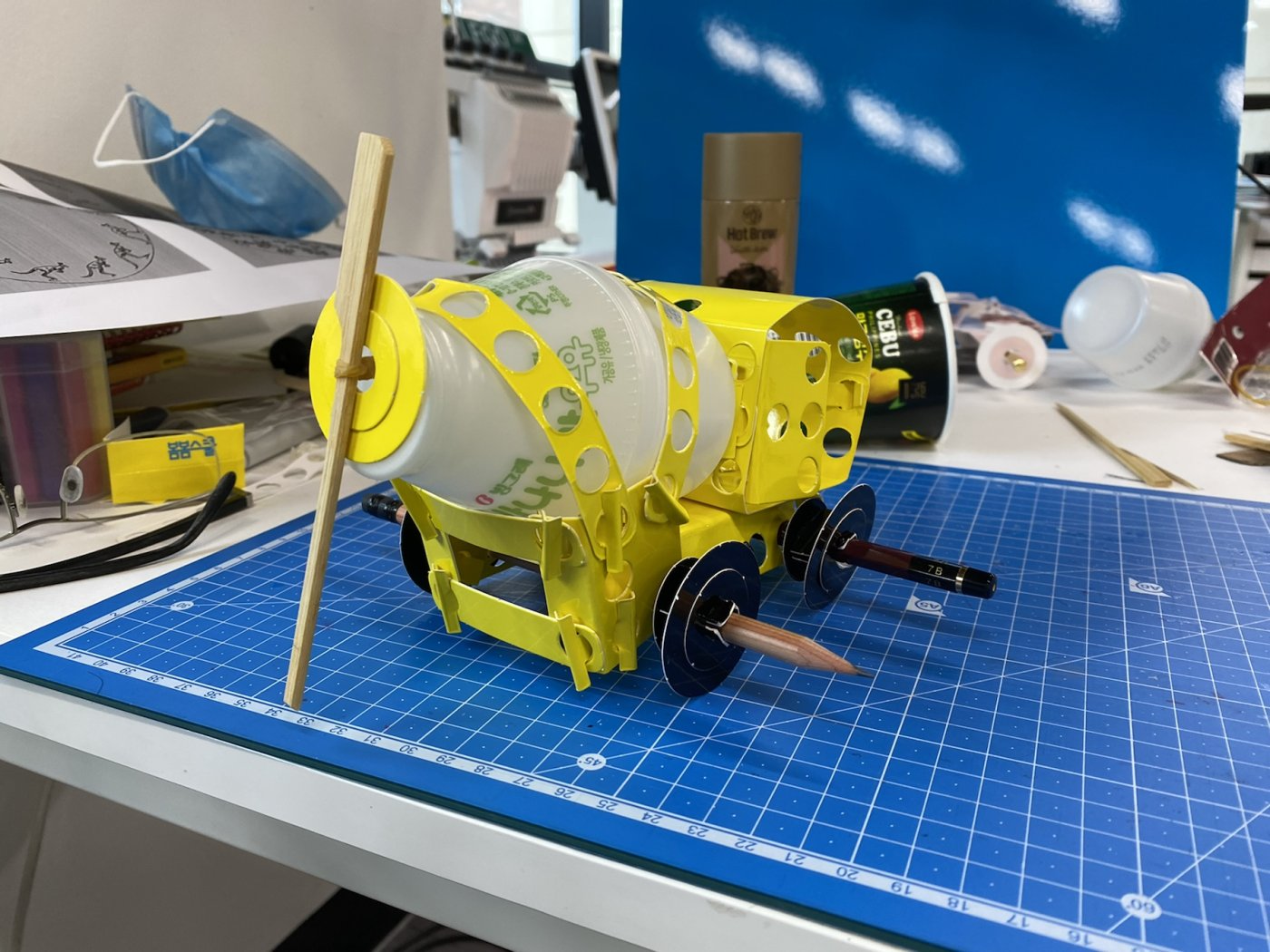 페이퍼브릭에 바나나 우유를 붙여 레미콘을 만들었고 이번에는 고무줄을 이용해서 레미콘을 돌려보려고 제작했습니다.