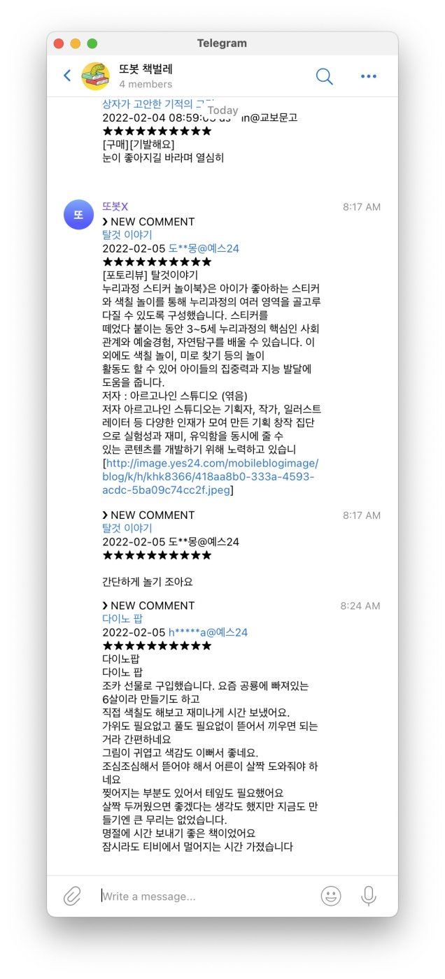 수 만개의 서평을 매일 수집하고 있으며 수집된 글은 메일, 텔레그램, 티스토리, 워드프레스 같은 곳으로 게시글로 퍼트리고 있습니다. 이유는 한 가지 더 많은 독자들에게 순수 독자서평을 퍼트리면 관련링크를 많이 퍼져 새로운 구매를 시킬 수 있다는 것입니다.