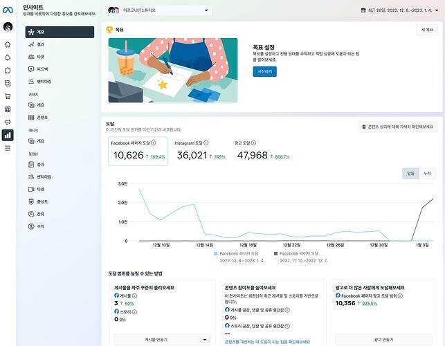 적은 돈으로도 확실히 게시물 조회수가 증가 현재 일반적인 포스팅으로는 양 매체에서 의미있는 구매전환을 가져가기 힘들어졌다 장난이지만 일주일에 25만원을 썼고 한 번 노출한 다음에는 서서히 참여도가 떨어지는 것을 볼 수 있다. 사실 페이지에 지속적인 콘텐츠를 올린다면 증가폭을 늘릴 수 있지만 사실 좀 바쁘기도 하고 2023년에는 다른 방법을 콘텐츠 제작 및 서비스를 구성하기 위해 준비중이라 신경쓸 여력이 없었어요.