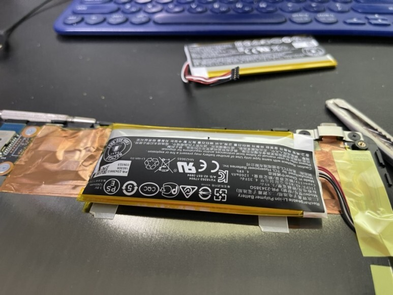 사진에 왜곡이 있는 게 아니라 배터리가 부풀어서 상단면이 휘어짐 AS가 가능한지 알아보았으나 생각보다 관련 정보도 없고 그냥 새로 사라는 말밖에 없어서 그러면 살려볼까?라는 생각을 하고 검색을 해봤으나 정보가 별로 안 남아서 제조 배터리 정보를 확인하고 검색을 했습니다.