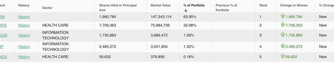 1. $ARM, 63.95% 2. $RXRX, 32.98% 3. $SOUN, 1.59% 4. $TSP, 1.32% 5. $NNOX, 0.16%