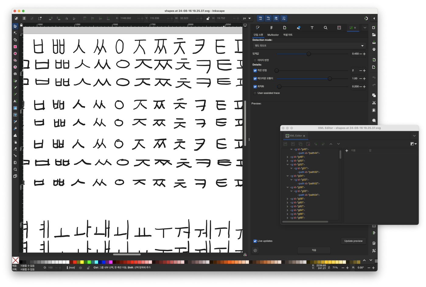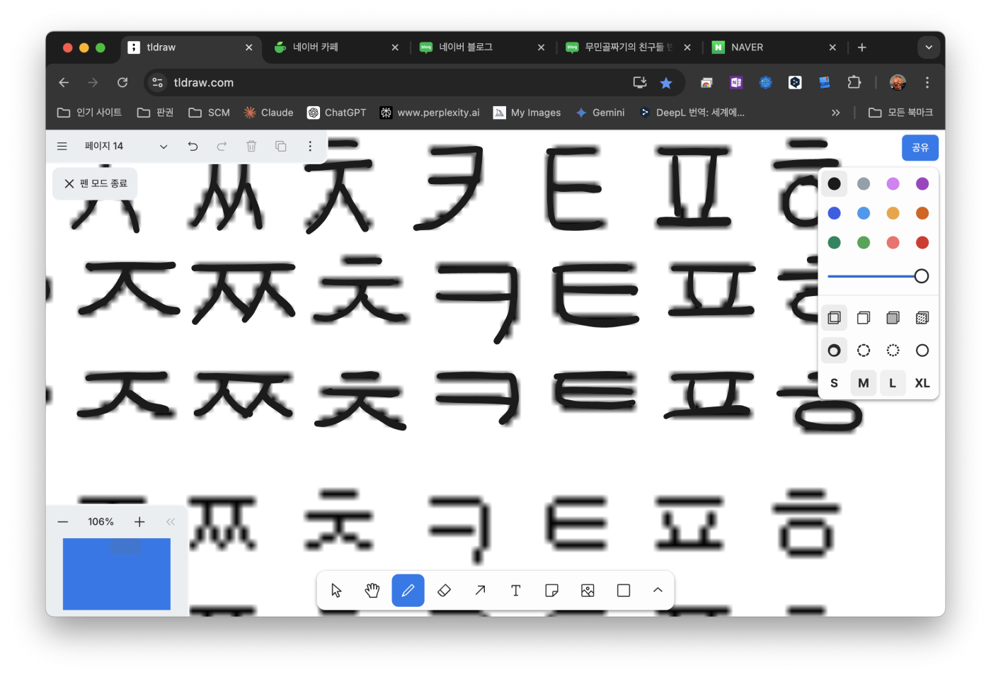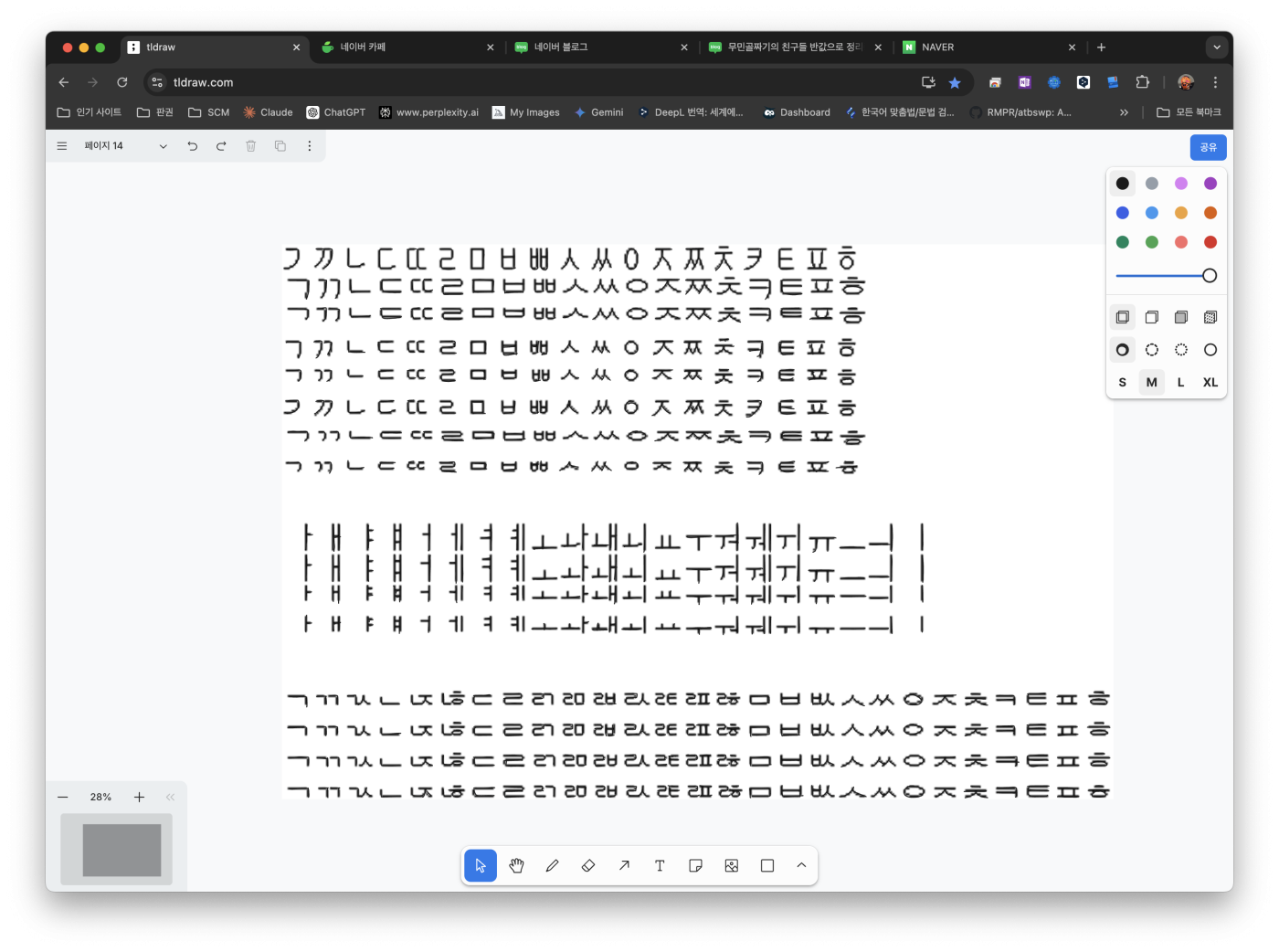 밑그림의 글자 위에 손글씨 느낌이 나게 tldraw로 초성, 중성, 종성 모양대로 그려줍니다. 같은 ㅎ 자도 어디에 위치하느냐에 따라 모양이 모두 다른 것을 감안해서 그려줘야 하며 256자 기준으로 작업하면 되는데 눈이 침침해서…