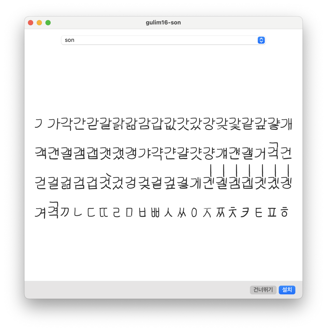 완성된 것은 아니지만 초성, 중성, 종성을 스타일을 하나 정해서 따라 그리면 굴림, 돋움, 궁서, 안상수 탈네모꼴 글꼴이 만들어지게 하는 것을 목표로 256자에서 1만 1172자가 생성됩니다. 일러스트레이터에서 그린 폰트를 사용하면 더 멋진 글자가 만들어지며 디자이너 디지털 굿즈가 되게 할 생각입니다.만화폰트, 캐릭터도장폰트, 아바타폰트, 효과음폰트, 스티치폰트, 따라쓰기용 폰트, 미로찾기폰트 등의 조합은 곧 완성하도록 하겠습니다. 텀블벅에 올려볼까 생각하던 것이라 미친생각에 동참할 분들이 생기겠죠.