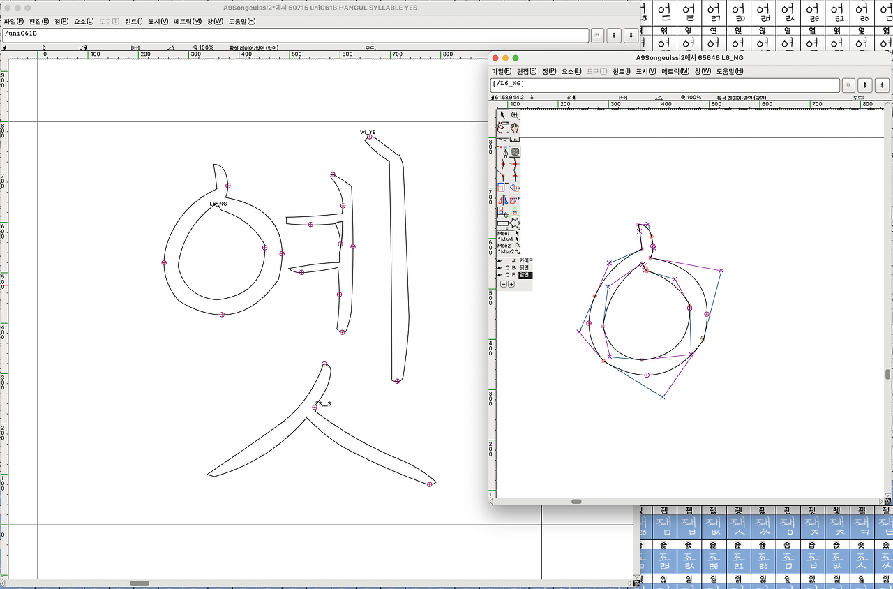 보이는 대로 폰트가 계속 만들어지기 때문이죠. 일러스트레이터, 어피니티 디자이너 같은 벡터 에디터에서 폰트를 그대로 보면서 만듭니다.