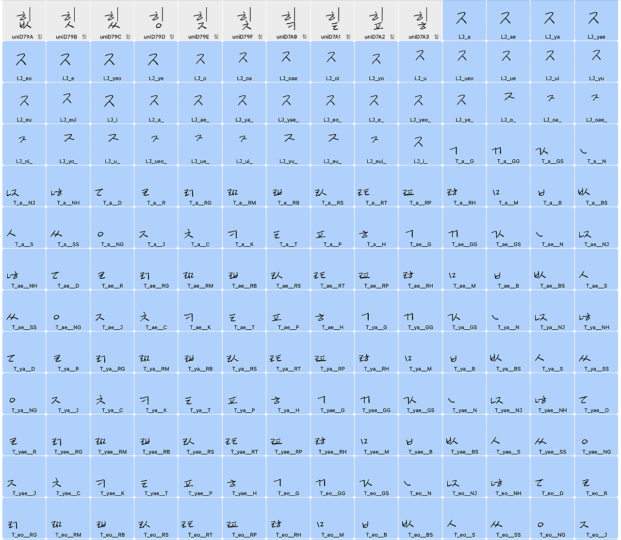 사실 폰트를 만들 때 컴포넌트를 만들어서 글씨가 어떤 모양에 따라 다 다른 초성을 만들어 넣게됩니다. 예를 들어 ㅔㅣ 같은 경우 초성의 모양이 달라지죠… 저희가 만든 폰트 생성기는 바로 폰트편집기에서 부분 수정이 모두 가능하도록 작업을 해놨습니다.