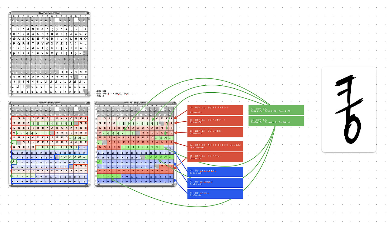 • 방사형 배치에 따라 각 초성, 중성, 종성이 자연스럽게 조화를 이루도록 패턴과 알고리즘 개발.