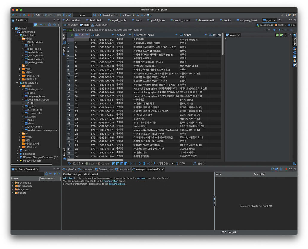 참고로 출판데이터는 전부 끌어와서 다시 온전한 출판데이터로 만드는 것은 거의 끝냈습니다. 97, 88 다 되고 출판 어쩌고 단체들 데이터도 다 가져와서 onyx, bookschema로 바꿨고 온라인 서점의 고유코드를 전부 관리합니다.