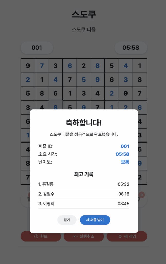 – 퍼즐을 푸는 데 걸린 시간을 기록하거나, 랭킹 시스템 도입.