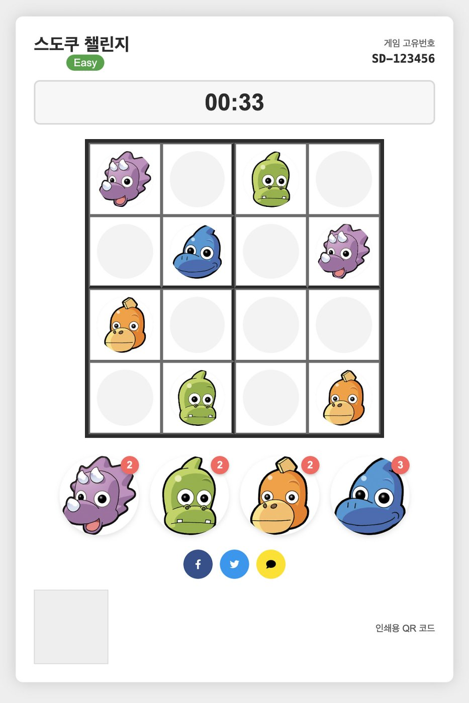 스도쿠챌린지 게임은 캐릭터, 프로필, 책표지, 연예인 멤버 등등 다양한 용도로 사용할 수 있도록 만들었고 같은 시간에 함께 스도쿠 퍼즐을 즐길 수 있게 구성했습니다. 웹에서 사용할 수도 있고 PDF로 프린트할 수도 있고 게임으로 즐기는 것을 종이책으로도 그대로 즐기실 수 있게 구성했습니다.