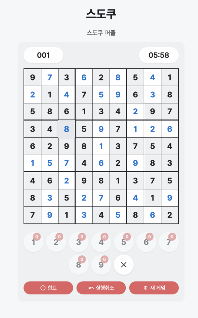 – **스도쿠 로직**: JavaScript로 스도쿠 생성 및 검증 알고리즘 작성(예: 백트래킹 알고리즘 활용).