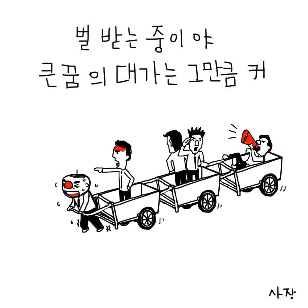사장툰 – 벌받는 중 2025년 11월 30일 작성자: admin 하고 싶다고 하고 싶은것을 하려고 성공은 모르겠고 그냥 자유롭고 싶고 생각한 결과를 보고 싶은 작은 소망인데 남들에게는 큰 꿈이고 그 대가를 치루기 위해 지금을 모두 소진중 #사장 #사장툰 #꿈 #목표 #함께 [도서] 악당의 명언 (완전판) 손호성 저 | 생각정리연구소 | 2019년 10월 구매혜택비주얼 카드 증정(포인트 차감, 한정수량)