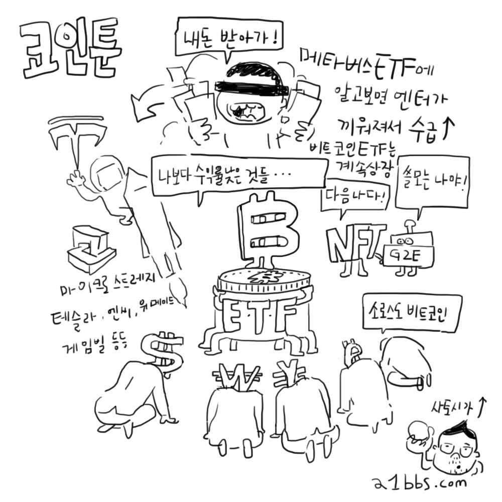 비트코인 ETF 출시 후 상승장에 돌입했다. 잠깐 동안 10% 이상의 수익을 올리고 있는 것으로 보면 세상일이란 결국 수급에 의해 모든 것이 결정되는 것 아닌지 다시금 생각해 보게 된다. 얼마 전 메타버스 ETF가 등장하면서 횡보장에서 관련 주식들이 일제히 상승하기 시작했고 지금은 포함된 개별주도 무섭게 오르고