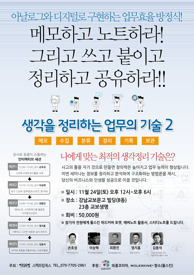 디지탈시대에 오히려 화두가 되고 있는 아날로그 방식으로 업무를 효율화하는 방법들을 제시하는 세미나입니다. 생각을 정리하고 자신의 아이디어를 구체화 하는데 필요한 방법들을 실제 업무에서 사용하는 8명의 강사들이 자신만의 경험을 나누는 세미나이며 일방적인 지식전달이 아닌 제공되는 노트와 문구, 대시보드를 통해 직접 참여해 볼 수 있는 체험형 세미나가 될 것입니다.