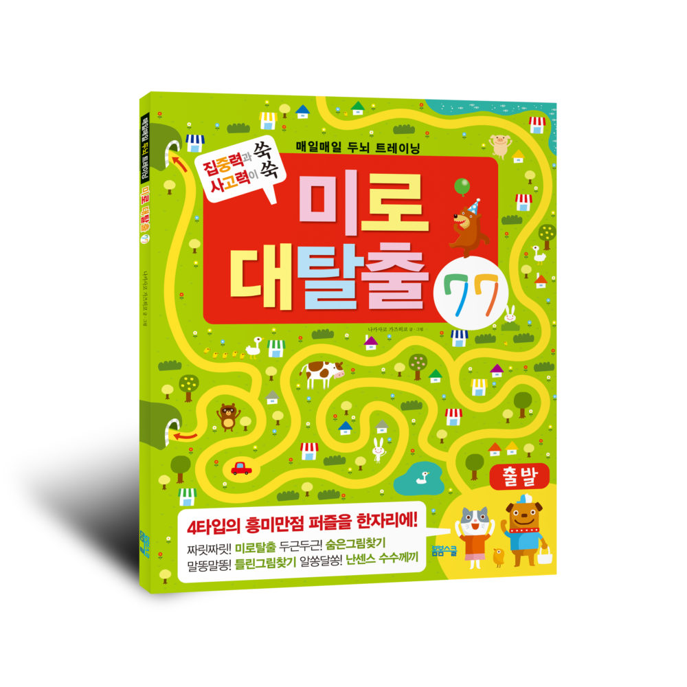 ‘숨은그림찾기’와 ‘틀린그림찾기’ 역시 많은 주의력이 요구되는 퍼즐들이다. 실제로 신경정신과에선 주의력 부족으로 판정받은 아이들을 대상으로 ‘숨은그림찾기’와 ‘틀린그림찾기’를 치료 교재로 활용합니다.한편 『미로 대탈출 77』에 수록된 퍼즐들은 뒤로 갈수록 난도가 높게 꾸며져 있습니다. 초반엔 쉬운 퍼즐로