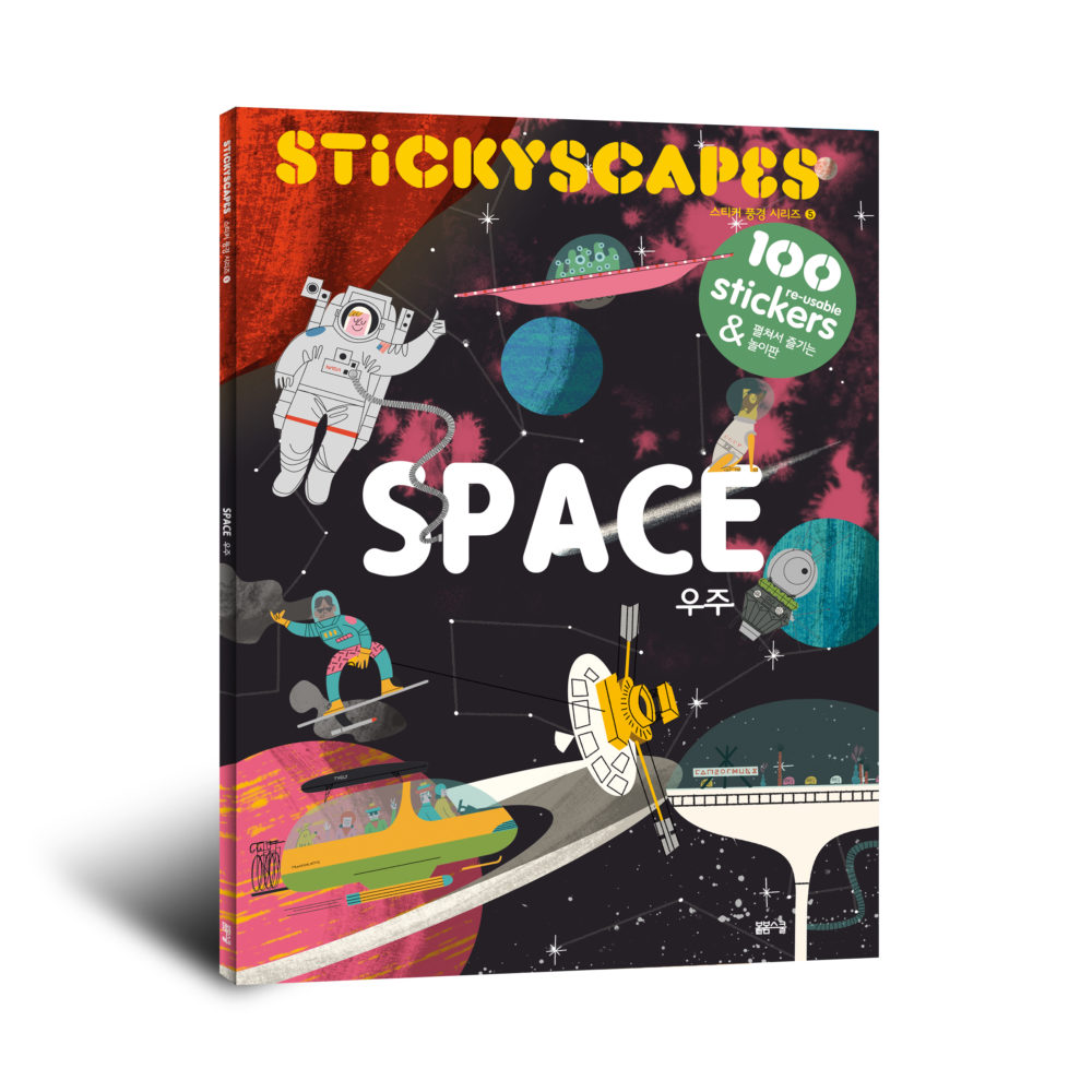 『스티커 풍경 시리즈 – 우주 편』은 100여 종의 스티커로, 길게 펴지는 파노라마 형식의 보드에 과거와 미래의 우주 탐험을 꾸미는 스티커북입니다.