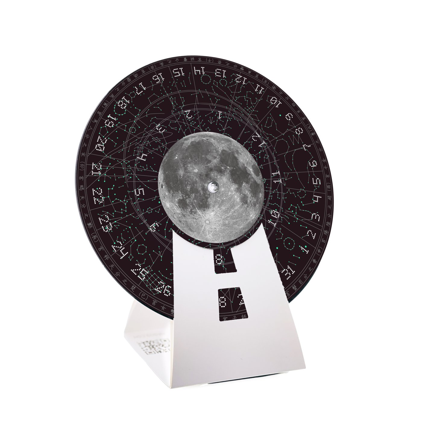 우주의 시간처럼 일, 월 두개의 회전하는 휠을 사용하는 만년력에는 특별한 비밀이 있습니다. 모든 별을 형광물질로 제작하여 함께 동봉한 비밀 펜(블랙 라이트 UV-A)을 비추면 어둠 속에서 별자리가 선명하게 나타납니다.(별도구매)