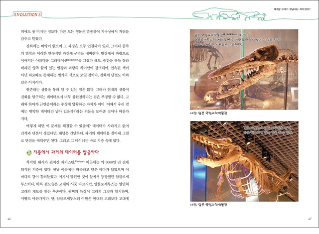 ‘고래는 옛날에 하마였다?’, ‘새의 공룡 기원설은 엉터리?’ 이런 의문을 속 시원하게 해결할 수 있는 방법은 없을까? 설령 타임머신이 있다 해도, 이런 문제를 확인하는 데는 큰 도움이 되지 않는다. 만약 우리가 천 년 동안의 역사를 관찰하려고 한다면, 천 년이라는 시간이 걸리기 때문이다. 이처럼 생물 진화의 역사에는 아직도 풀리지 않은 여러 가지 미스터리가 남아있다. 그런데 이 진화의 비밀을 알려면 대체 어떻게 해야 할까?