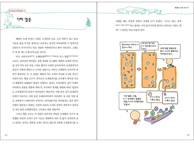 특히 이 책은 전개 방식이 남달라 백과사전식으로 지식과 정보를 나열하지 않는다. 기존 지식에 의문을 제기하고, 다양한 자료를 바탕으로 여러 생물학 이론을 대입, 추론하고 결과를 이끌어내는 식이다. 이런 과정을 통해 저자는 우리의 상식을 무너뜨리고 진화에 대한 새로운 사실을 알려준다. 그렇다고 이 책을 따분한 학술서로 오해하지는 말자. <생물선생님도 몰래 보는 진화론>은 각종 그림과 사진을 풍부하게 활용해 생물의 미스터리를 재미있게 풀어낸 책이다.