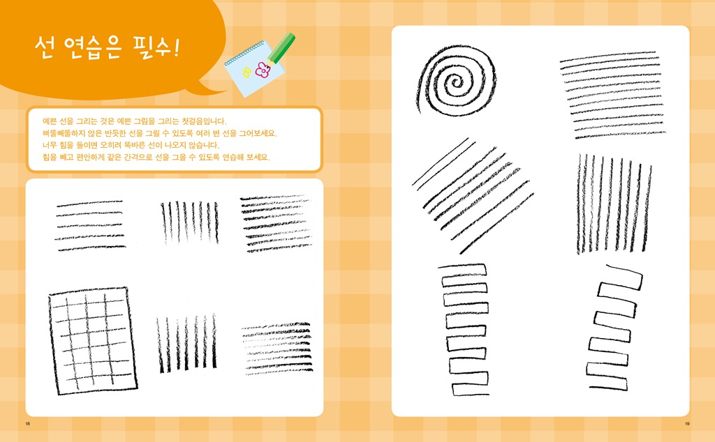 <즐거운 그림교실 스케치북 2>은 도톰한 모조지와 스프링 제본으로 아이들이 스케치북에 그리는 느낌을 생생하게 느낄 수 있도록 구성했습니다.