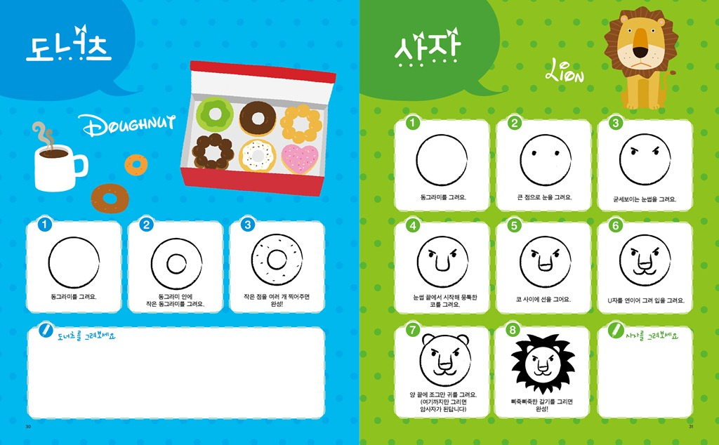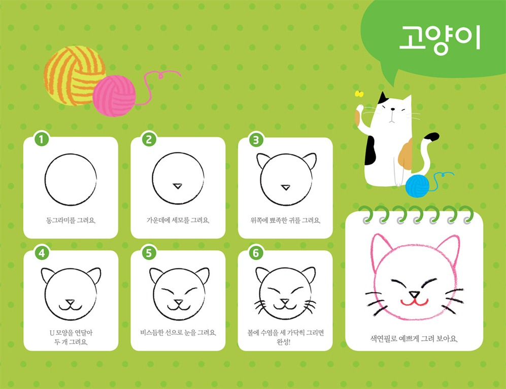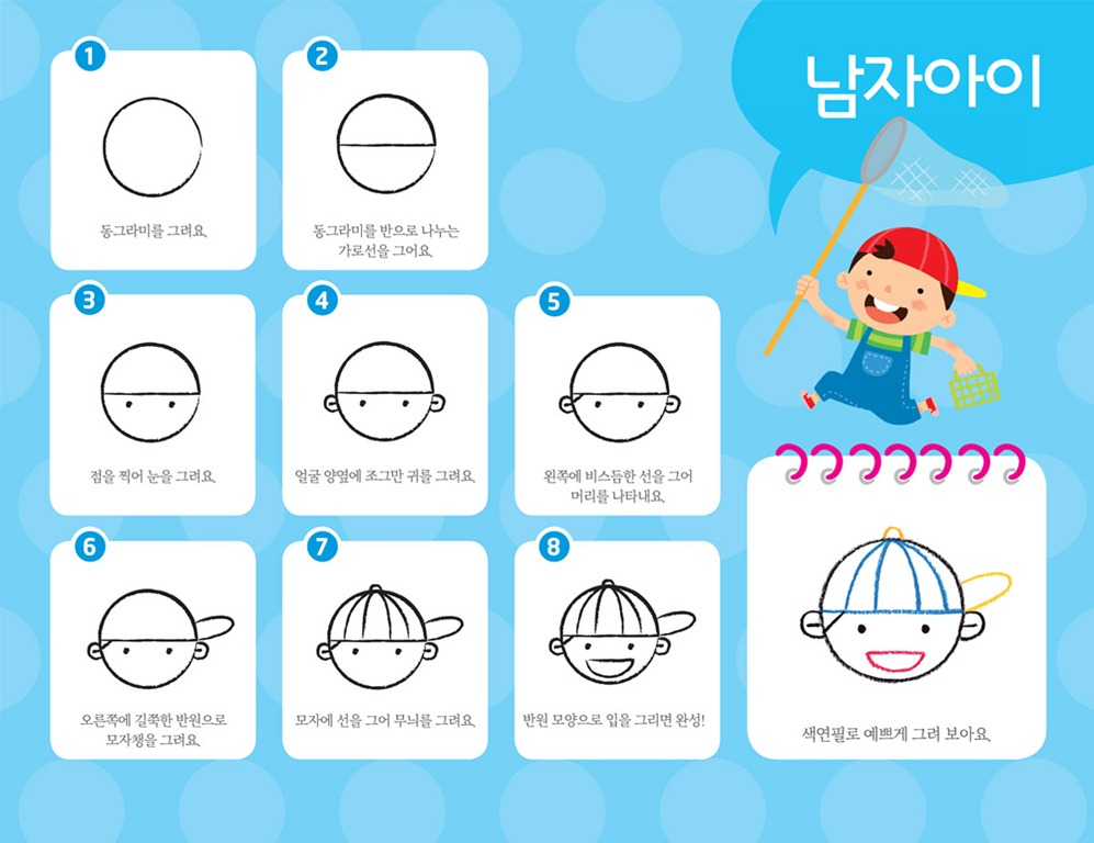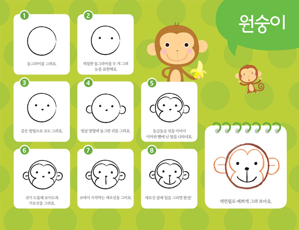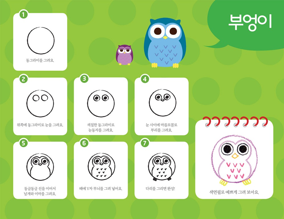 동그라미, 반원, 물방울 모양, 사다리꼴, X자 모양으로 부엉이, 원숭이, 코알라 등의 동물에서부터 해바라기, 탱크, 풍차, 화분 등의 다양한 사물까지 쉽게 그릴 수 있습니다. 정말 신기하게도 원을 그리고 선을 긋고 점을 찍는 것만으로 예쁜 그림이 완성되지요. 아이는 자신의 손에서 그려진 예쁜 그림을 보고 자신감을 가지게 되며 더는 그림을 두려워하지 않게 됩니다.