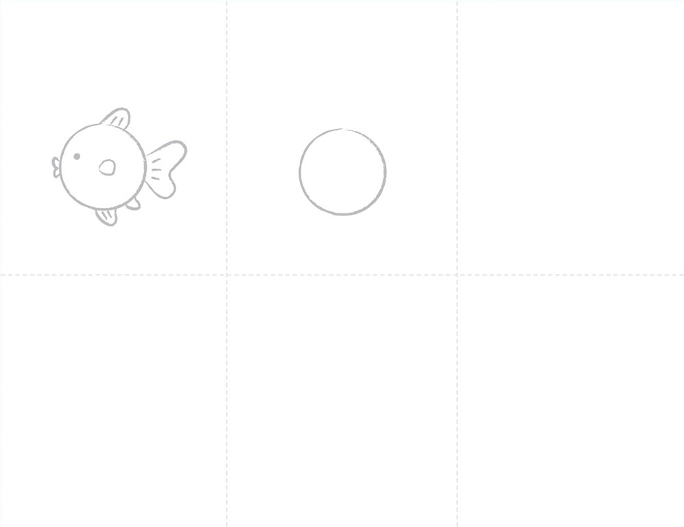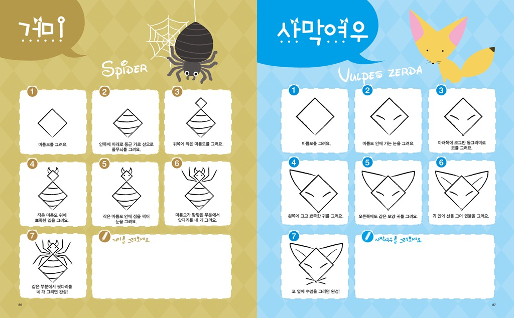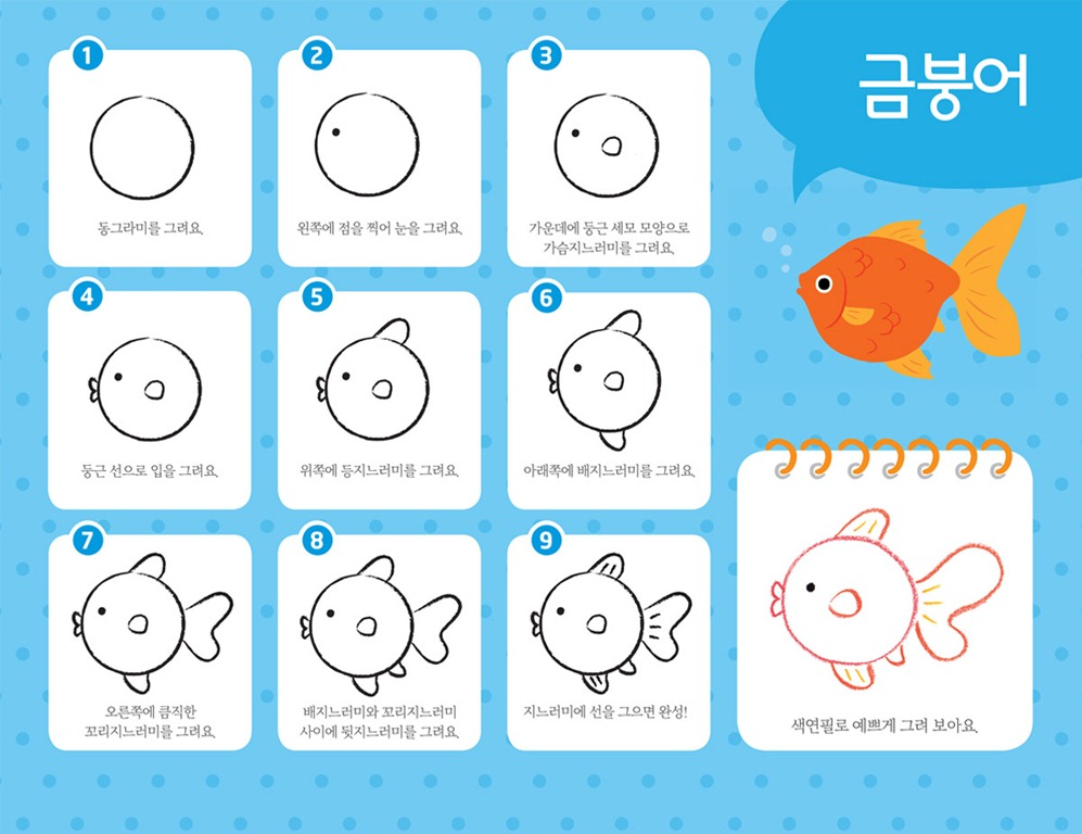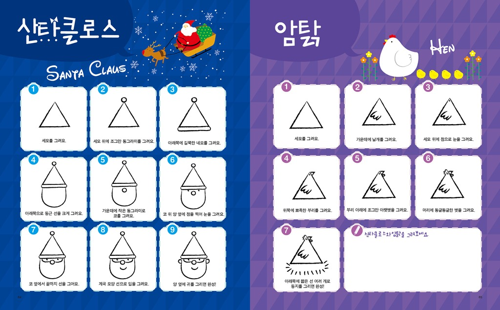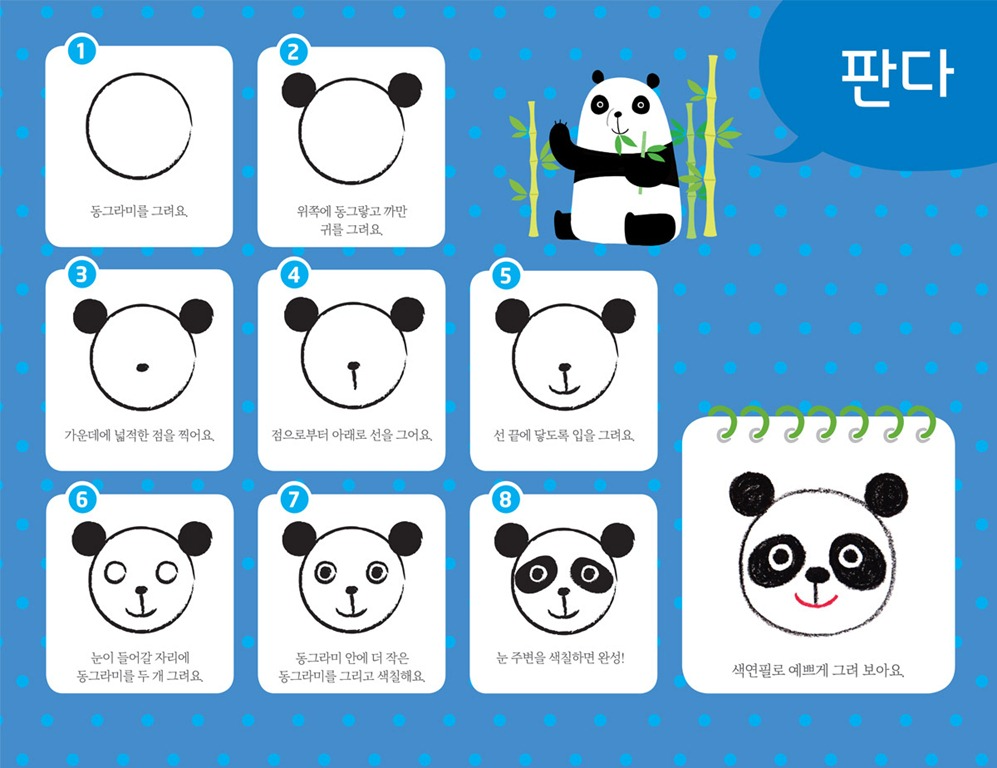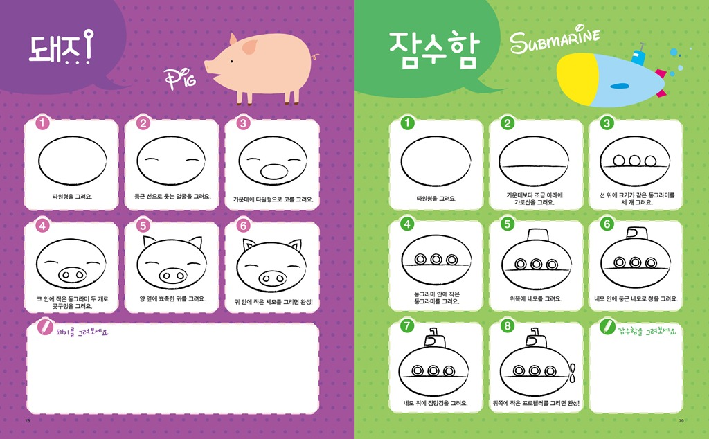 동그라미, 반원, 물방울 모양, 사다리꼴, X자 모양으로 부엉이, 원숭이, 코알라 등의 동물에서부터 해바라기, 탱크, 풍차, 화분 등의 다양한 사물까지 쉽게 그릴 수 있습니다. 정말 신기하게도 원을 그리고 선을 긋고 점을 찍는 것만으로 예쁜 그림이 완성되지요. 아이는 자신의 손에서 그려진 예쁜 그림을 보고 자신감을 가지게 되며 더는 그림을 두려워하지 않게 됩니다.