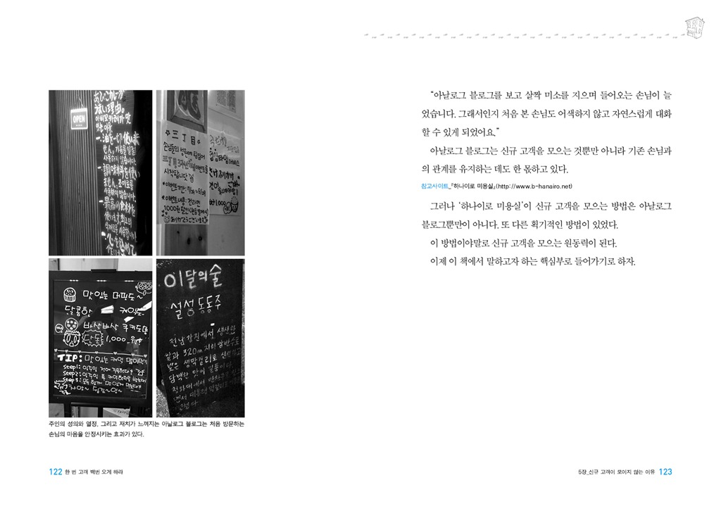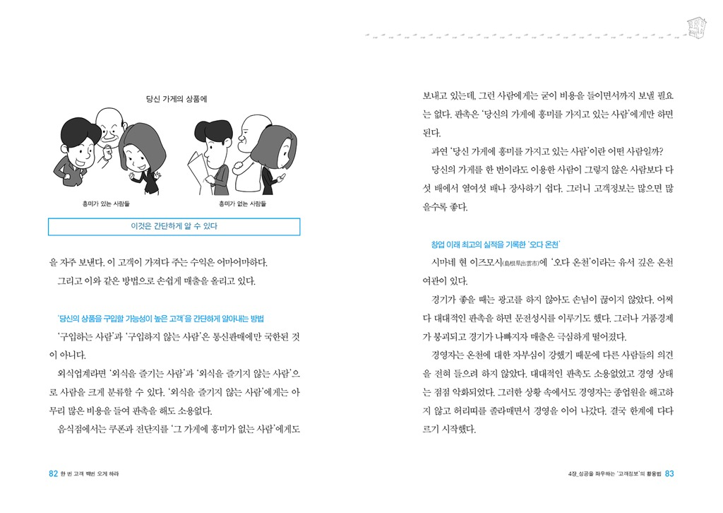 신규 고객을 고정 고객, 즉 ‘단골’로 만들어야 가게가 성공할 수 있다는 것은 당연한 얘기다. 모두 이 사실을 알고는 있지만 아무나 이렇게 만들지는 못한다. 오히려 신규 고객을 유치하는 것조차 힘들 정도다. 이를 위해 <한 번 고객 백번 오게 하라>에선 신규 고객을 모으는 방법과 그 고객을 고정 고객으로 만드는 방법에 중점을 두고 있다.