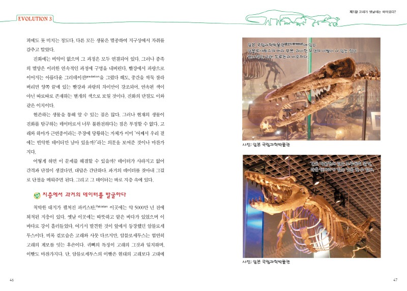 ‘고래는 옛날에 하마였다?’, ‘새의 공룡 기원설은 엉터리?’ 이런 의문을 속 시원하게 해결할 수 있는 방법은 없을까? 설령 타임머신이 있다 해도, 이런 문제를 확인하는 데는 큰 도움이 되지 않는다. 만약 우리가 천 년 동안의 역사를 관찰하려고 한다면, 천 년이라는 시간이 걸리기 때문이다. 이처럼 생물 진화의 역사에는 아직도 풀리지 않은 여러 가지 미스터리가 남아있다. 그런데 이 진화의 비밀을 알려면 대체 어떻게 해야 할까?