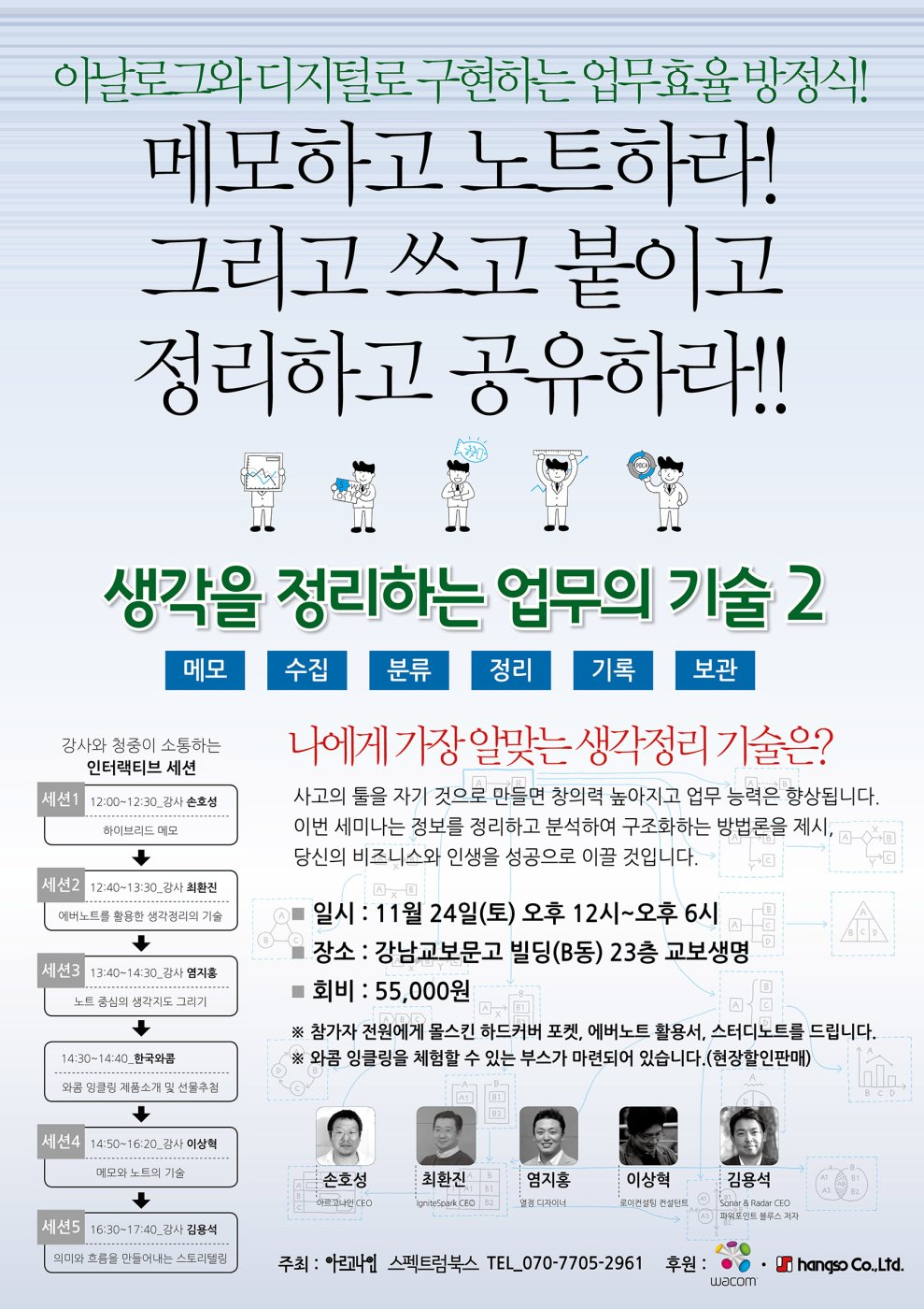 이번 세미나는 지난 7월21일에 진행된 생각을 정리하는 업무의 기술 (총7시간)과 다른 세미나로 이번에는 아날로그와 디지탈 편입니다. 스마트폰 2천만 시대에 생산성과 효율을 높이기 위해 오히려 아날로그에 집중하여 생각을 정리할 수 있는 다양한 도구를 소개한 1회 세미나에 이어 이번 세미나는 아날로그 메모와 업무방식을 스마트폰과 함께 보다 효율적이고 업무 스타일에 맞춰 실제 강사들의 경험을 함께 나누는 새로운 형식의 세미나로 준비했습니다.