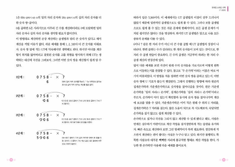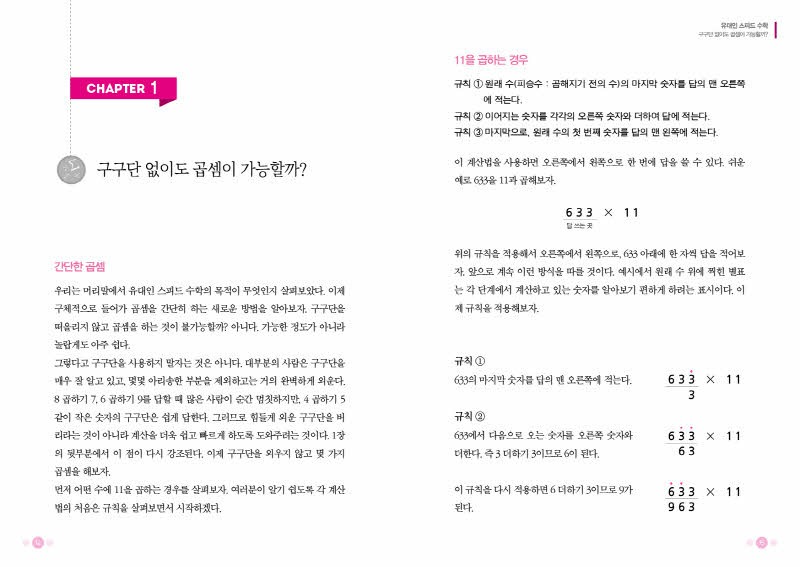 이 책에는 베다수학 외에도 손가락 계산법, 격자 계산법, 계산기의 원리가 되는 겔로시아 계산법 등 계산이 즐거워지고 수학에 흥미를 느끼게 되는 여러 노하우가 담겨져 있다.