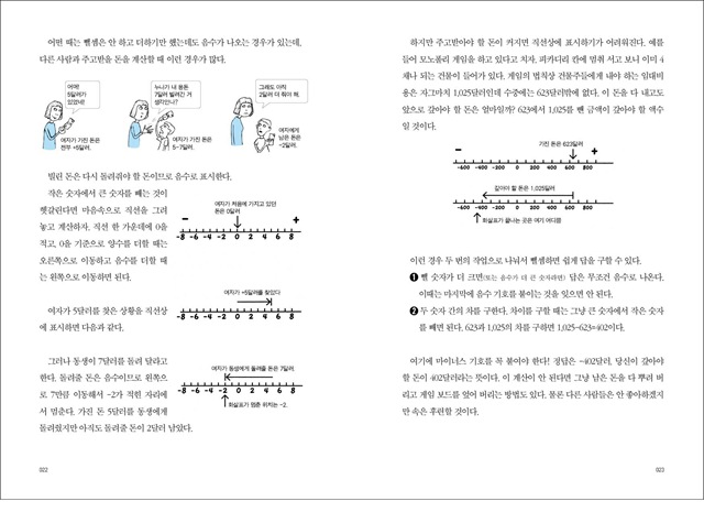 저자는 수식을 쓰고 계산기를 두드리기보다 ‘상상하는 수학’을 하라고 제안한다. 상상하는 수학이란 문제를 일상의 다양한 상황으로 상상해 보고 글이나 그림으로 표현해 보는 것을 말한다. 예를 들어 -2×-3이라는 식이 있다면 ‘욕조의 물이 1분에 2cm씩 줄고 있는데 3분 전에는 몇 cm 위까지 물이 차 있었을까’와 같이 문장으로 나타내 보는 것이다. 이런 방법으로 훈련하다 보면 공식을 모르더라도 일상에서의 경험을 바탕으로 직관적으로 답을 이끌어낼 수 있다. 더불어 상상력과 논리력도 기를 수 있다. 이것이 바로 수학적 사고다.