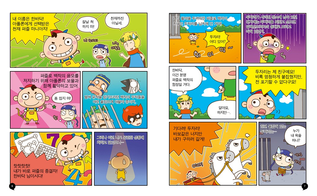 <불가사의 퍼즐 1-아폴론의 보물> 편에는, 퍼즐을 너무너무 좋아하는 한바닥과 친구인 두자리가 등장해요. 악당인 퍼즐로 백작과 그 부하들이 골치 아픈 퍼즐로 망가뜨려 놓은 세계의 유적들을 되돌리기 위해, 태양의 신 아폴론이 한바닥과 두자리를 퍼즐 모험에 초대한 것이지요. 퍼즐을 풀 때마다 퍼즐로 백작의 음모가 하나하나 밝혀지고, 못된 부하들도 사로잡을 수 있어요. 하지만, 퍼즐들이 그리 만만하지는 않답니다!