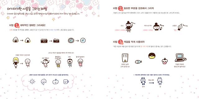 여행 노트나 스케줄러, 업무 수첩 등에 작고 귀여운 일러스트를 그려 넣으면, 세상 어디에도 없는 나만의 특별한 소지품으로 변신해요. 갖가지 동식물은 물론 캐릭터와 생활용품, 맛있는 음식, 학용품, 다이어리 꾸미기에 꼭 필요한 귀여운 아이콘들까지, 일러스트레이터 못지않은 실력을 키워보세요. 그림과 글씨를 이용한 꾸미기 외에도 일러스트를 덧붙일 수 있는 간단한 책가위와 책갈피, 피라미드 선물 상자 등을 직접 만들어 볼 수 있는 팁도 실려 있어요. 그리고 일러스트레이터인 저자들이, 일러스트를 더욱 예쁘게 그릴 수 있도록 펜을 고르는 방법도 자세히 알려준답니다.