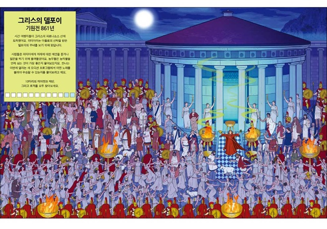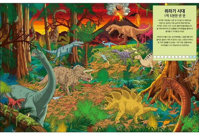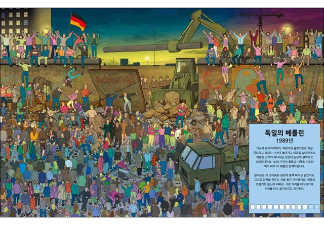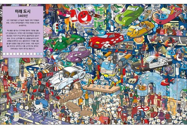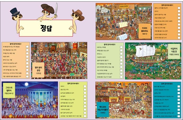 <미어캣을 찾아라!-시간여행 편>에서는 역사책에 빠지지 않고 소개되는 유명한 사건을 만나볼 수 있답니다. 알프스 산맥을 넘은 카르타고의 명장 한니발이 혼비백산한 로마군을 무찌른 사건이나 30년 가까이 동독일과 서독일을 가르고 있던 베를린 장벽이 무너진 사건 등 한번쯤 들어봤을 법한 이야기들을 직접 눈으로 확인할 수 있어요. 또한 무시무시한 공룡들이 들판을 뛰어다니는 쥐라기 시대, 최첨단 로봇이 가득한 미래의 도시 등 머릿속으로만 상상했던 장면 속으로 떠나볼 수도 있지요. 책으로만 읽었을 때는 지루했던 역사 속 사건이라도 실감 나는 그림으로 직접 보면 흥미진진하기도 하고 기억에 더 오랫동안 남을 거예요.