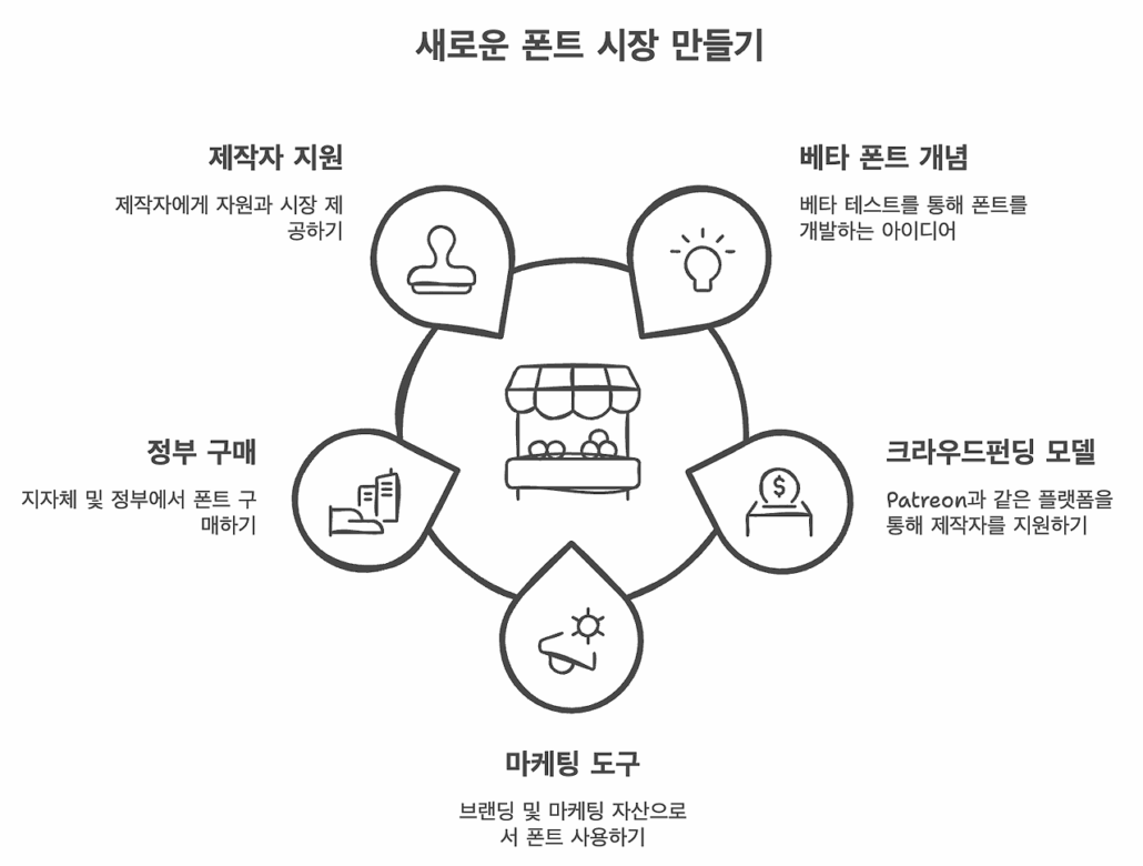 그리고 베타폰트라는 개념을 생각했고 어떤 폰트를 만들고 완성될 때까지 계속 테스트 및 사용을 할 수 있게 해주는 베타테스트 할 수 있는 참여자를 모아 초기에 펀딩 하듯 제작자를 후원하는 패트레온과 같은 형태의 시장을 만들려고 합니다.