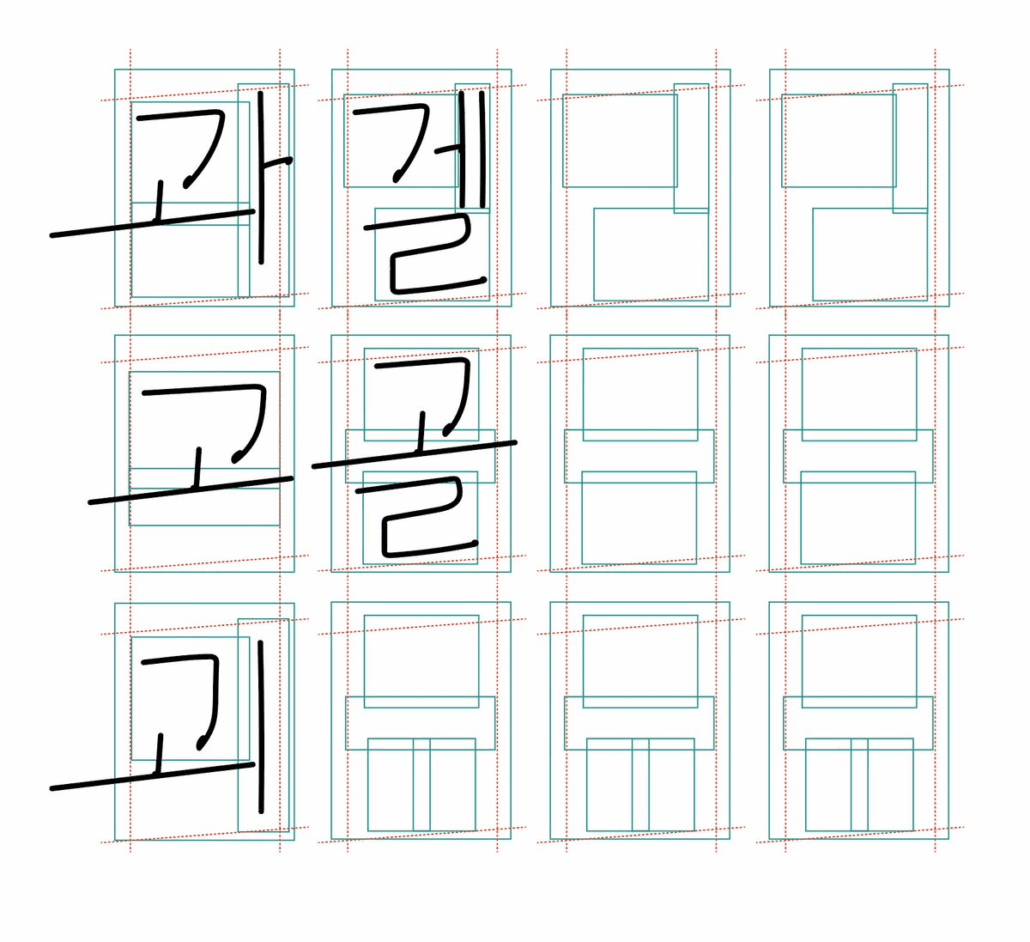일단 가로 세로를 한 번에 작업하기 때문에 일정하게 균형을 유지할 수 있습니다. 특히 세로줄의 ㅏㅣㅖㅒㅞㅟㅘㅙ 등의 모양을 기준으로 잡고 작업을 하며 ㅗㅡㅜㅠㅛ 와 같은 가로줄의 가이드를 맞출 수 있습니다. 작업에 대한 방법론은 영상으로 남기겠지만 일단 방법론에 대해서 이야기드립니다.