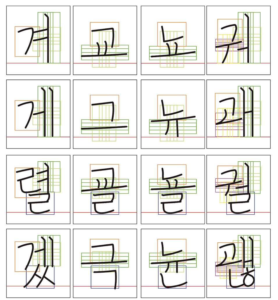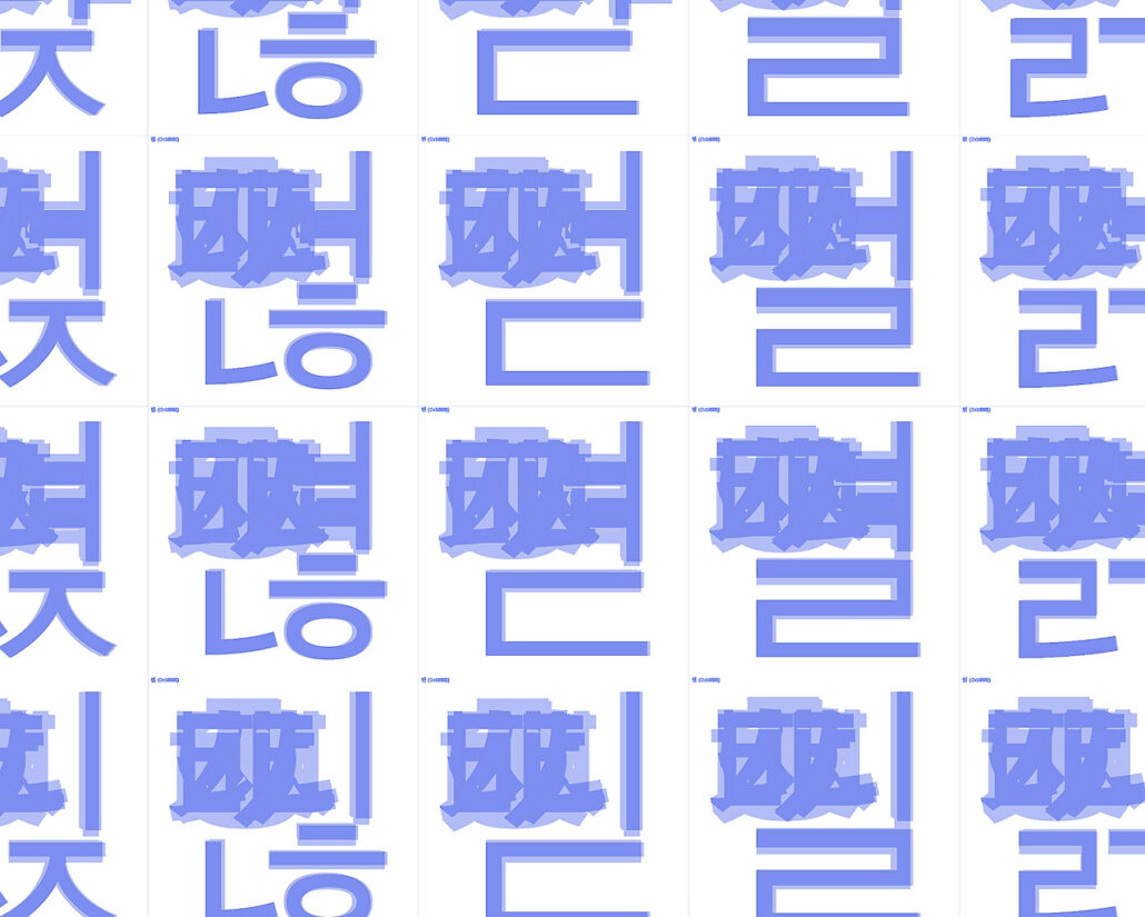 초, 중, 종성의 컴포넌트의 위치값을 이용해서 너비 높이를 조절해서 두깨나 모양을 유지하면서 배치할 수 있게 만드는 것을 할 수 있기 때문입니다. 일정 유형을 학습해서 하나의 폰트가 수 많은 특성을 가진 폰트의 유형으로 뽑아낼 수 있습니다.