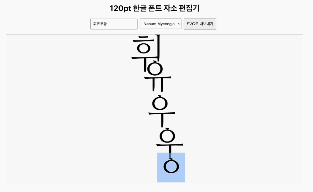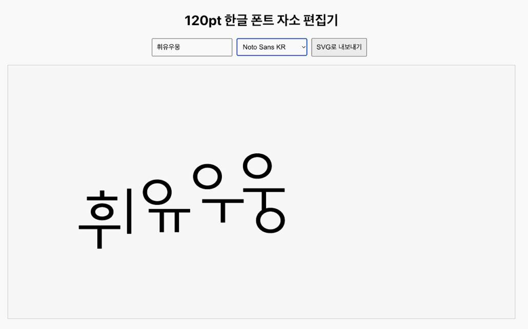 클립스튜디오에서 만화용의 초성, 중성, 종성만 그리고 벡터로 중심선이나 괘선 위에 만화작가가 그린 그림에 맞게 본인이 쓴 글씨의 부분을 가지고 작업할 수 있는 한글 만화효과음 편집기를 간단히 만들어 봤습니다. 사실 SVG를 하나씩 선택하게 해서 서로 다른 폰트의 조합을 운영하기 위한 테스트를 실행해봤습니다.